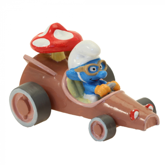 Pitufo en el coche champiñón, figurita Pixi de plomo colección Los Pitufos Origine código de circulación, realizada de manera artesanal esculpida y pintada a mano, una auténtica pieza de colección. Edición numerada y limitada a 410 ejemplares con certificado de autenticidad. Altura: 3,8cm.