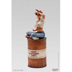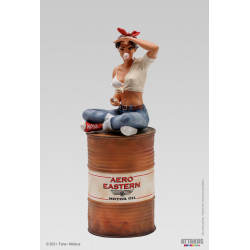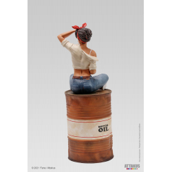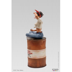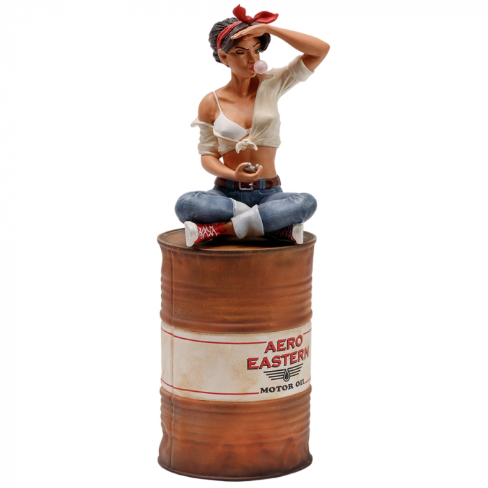 Descubre esta preciosa estatua en resina pintada a mano realizada por la empresa Attakus de Lillie Roadrunner, Pin-up de los años sesenta. Traviesa con su pompa de chicle, está sentada sobre su barril. Edición limitada y numerada a 350 unidades con certificado de autenticidad firmado a mano por ‘Fane. Altura: 18cm.