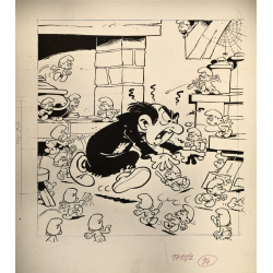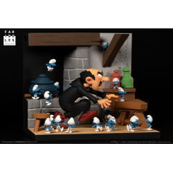 Escena de colección Fariboles Gargamel con Los 21 Pitufos y la araña. Del universo de los Pitufos de Peyo. A moi les Schtroumpfs !! Edición limitada y numerada de 350 ejemplares con certificado de autenticidad. Entregado en una caja de madera. Dimensiones de la escena: 27x27x22cm.