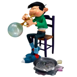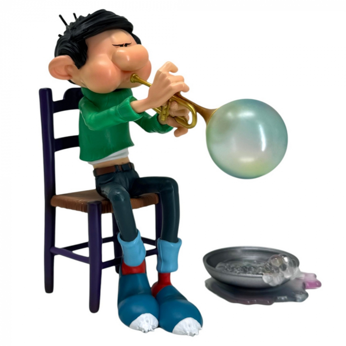Los inventos de Gaston Lagaffe, trompeta de pompas de jabón. Figurita de colección de alta calidad en resina, pintada a mano. Altura: 16cm.