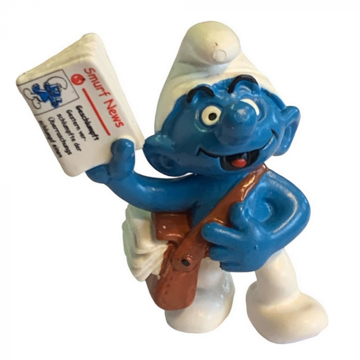 Figurita de PVC Schleich, Los Pitufos: El Pitufo repartidor de periódicos. Cada figura está hecha de plástico de alta calidad, meticulosamente detallada y pintada a mano. 5,5cm.