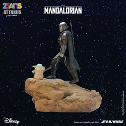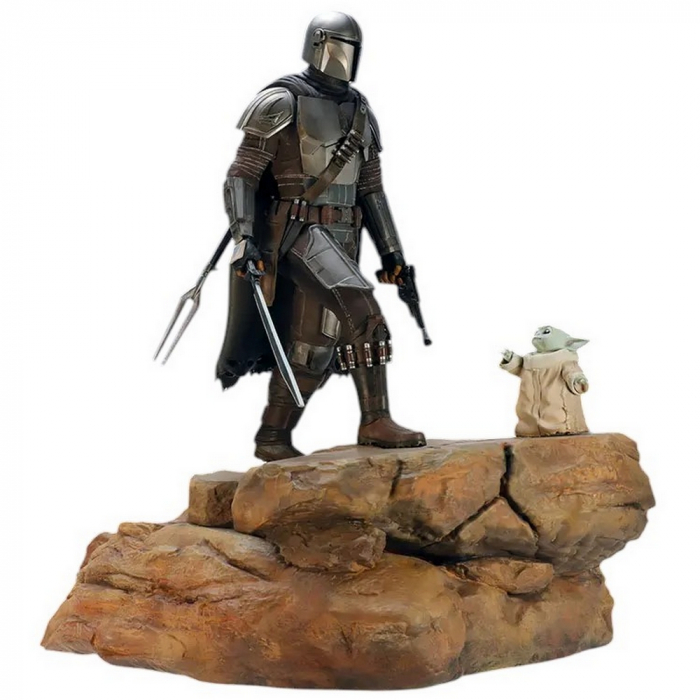 Diorama de colección Star Wars Attakus pintada a mano. Colección Prestigio 1/5: The Mandalorian & Grogu. Pieza creada para el 25.º aniversario de Attakus. Edición limitada y numerada a 80 ejemplares con certificado de autenticidad. Altura: 54 cm.