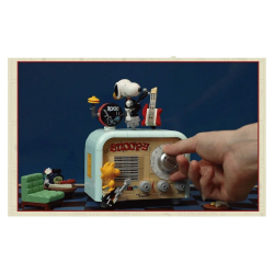Set de construcción Peanuts, Snoopy: Radio. Ispirado en la obra de Charles M. Schulz y creado por Pantasy. El set está formado por 305 piezas. La edad mínima recomendada es de 6 años. Incluye un manual de instrucciones. Gira el botón de la radio para hacer bailar a Snoopy y darle vida al rock retro. Altura: 16cm.