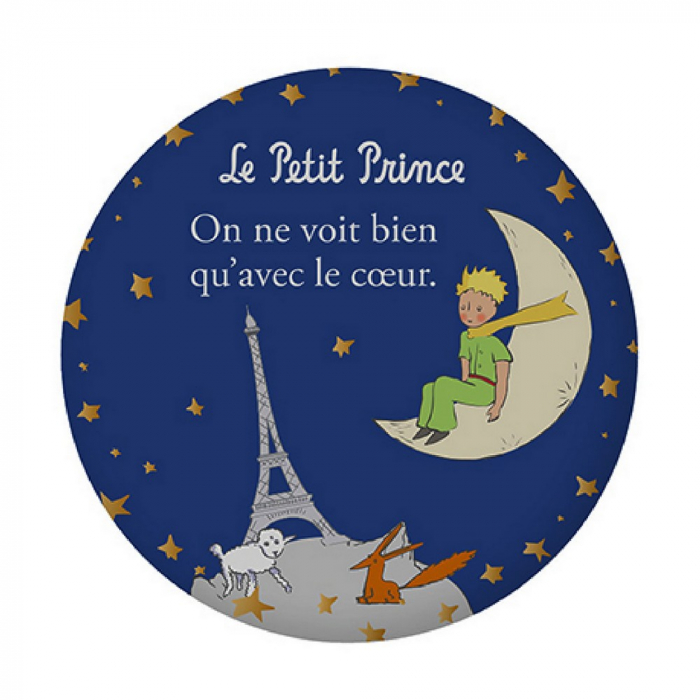 Imán redondo decorativo El Principito: El Principito sentado en la luna, Zorro, Oveja y Torre Eiffel. 55mm.