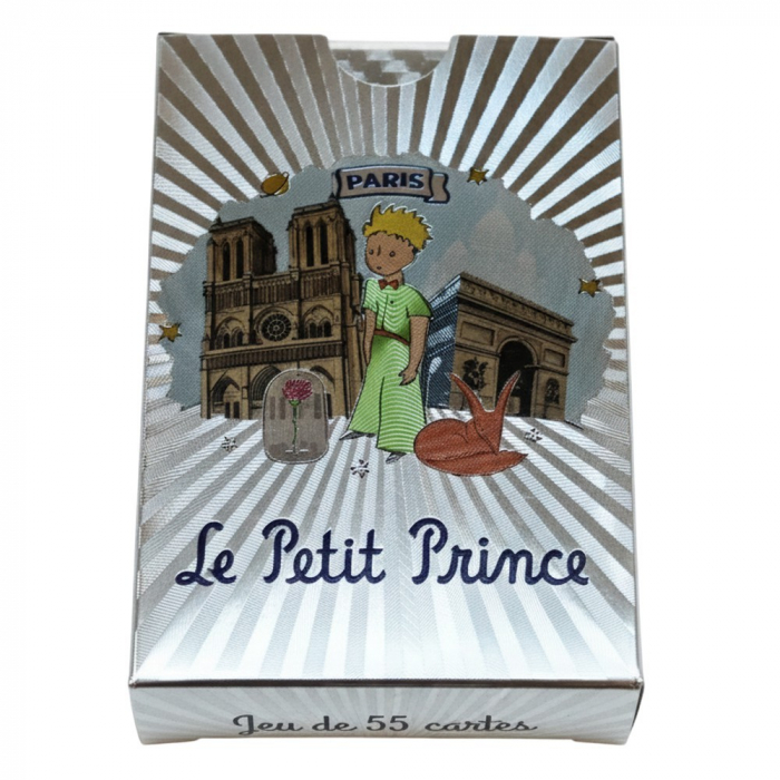 Se trata de una baraja francesa de 55 cartas con imágenes de los personajes principales del Principito como protagonistas.