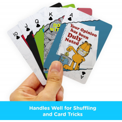 Se trata de una baraja francesa de 54 cartas con los personajes principales de Garfield como protagonistas.