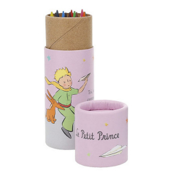 Tubo con 12 lápices de colores El Principito con un avión de papel de la marca Kiub. Altura: 8cm.