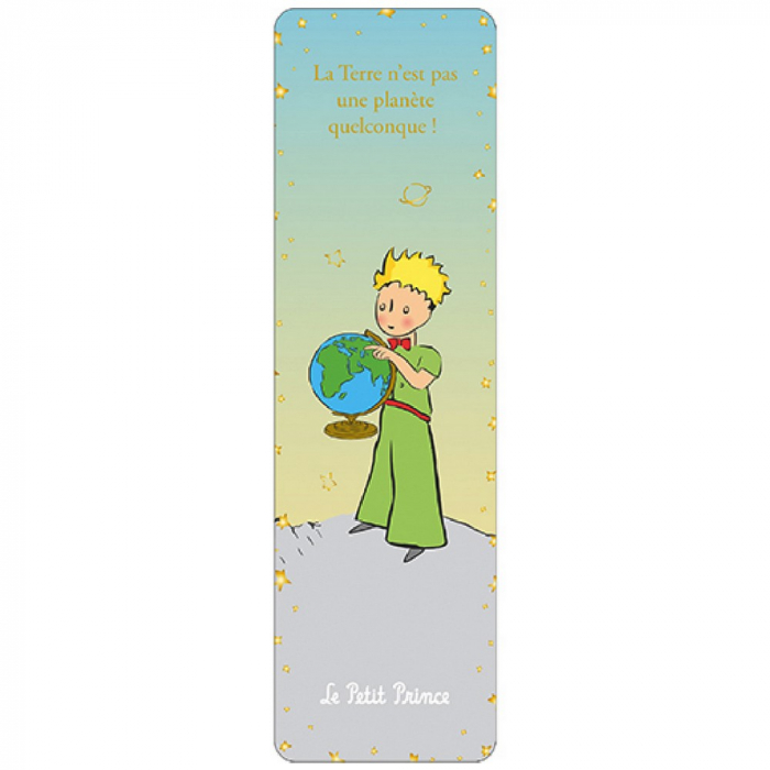 Marcapáginas de papel Kiub El Principito con la Tierra en sus manos. 54x172mm.