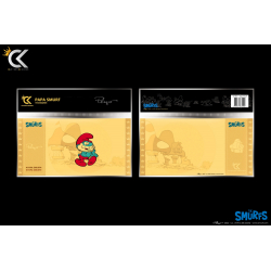 Billete de colección CK Los Pitufos: Papá Pitufo. Producto oficial en edición limitada de Cartoon Kingdom. Cada billete está cuidadosamente impreso en alta definición en papel de PVC lavable a prueba de rasgaduras y cubierto con una fina capa dorada muy brillante. Dimensiones: 14,5x7,5cm.