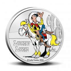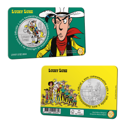 Moneda de 5 € acuñada por la Casa real de la Moneda de Bélgica en honor a Lucky Luke. Edición limitada a 7500 unidades. Moneda de curso legal en Bélgica, no para circulación. Color BU.