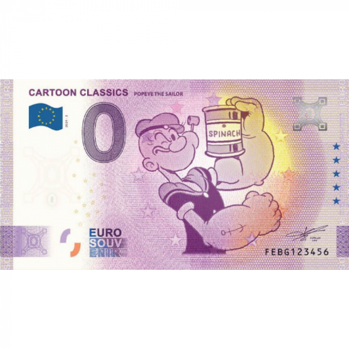 Billete de banco conmemorativo 0 €. Cartoon Classics Popeye. Edición limitada y numerada. 2025.