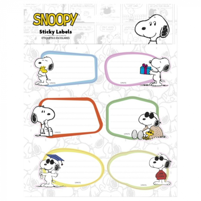 Este set de 12 etiquetas adhesivas premium Snoopy Peanuts de Grupo Erik es ideal para personalizar tus objetos. Fabricadas en papel autoadhesivo brillante de 80g/m2 con barniz de protección, se distribuyen en 2 hojas con 6 etiquetas cada una. Cada etiqueta permite identificar fácilmente tus cuadernos con el estilo único del famoso beagle de Charles Schulz.