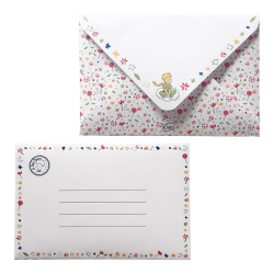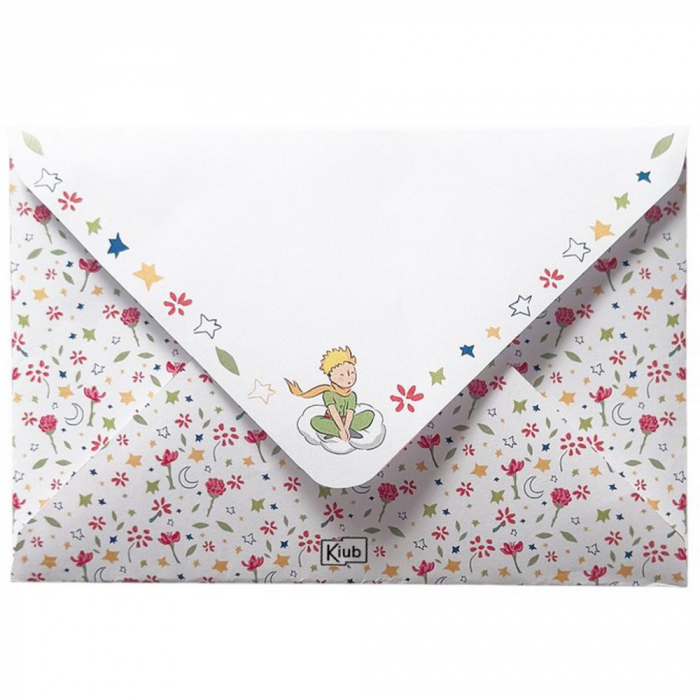 Realce sus envíos con este sobre ilustrado de El Principito creado por Kiub. Fabricado en papel de alta calidad, tiene unas dimensiones de 15x10cm, ideales para sus postales o invitaciones. Este modelo muestra al héroe en su nube rodeado de flores y estrellas de colores. Un accesorio de papelería indispensable para todos los apasionados de la obra de Antoine de Saint-Exupéry.