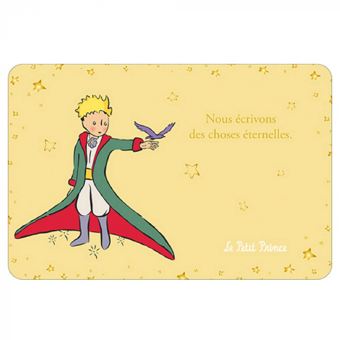 Postal de colección de la marca Kiub El Principito en traje de gala y el pájaro. 15x10cm.