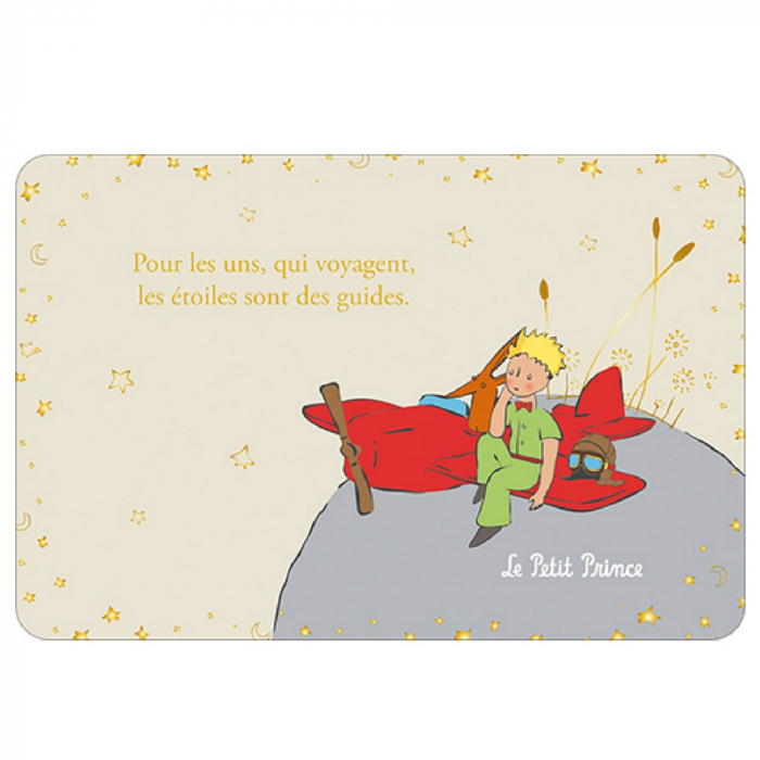 Postal de colección de la marca Kiub El Principito en su planeta con el avión y el Zorro. 15x10cm.