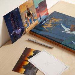 Set de 18 Postales Moebius, Arzak l'intemporel. Diseñado por Jean Giraud en los años 70, Arzak es reconocible por su sombrero cónico, su larga capa y su fiel pájaro pteroide. Se manifiesta en la forma atemporal del Starwatcher o un meditador bajo el pincel de su creador. Dimensiones de cada postal: 10x15cm.