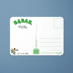 Postal de la marca Oneart El elefante Babar, pique-nique en famille. Acabado suave al tacto y antirrayas. Made in France. 10x15cm.