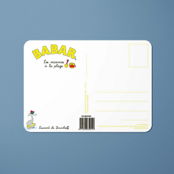 Postal de la marca Oneart El elefante Babar, les vacances à la plage. Acabado suave al tacto y antirrayas. Made in France. 10x15cm.