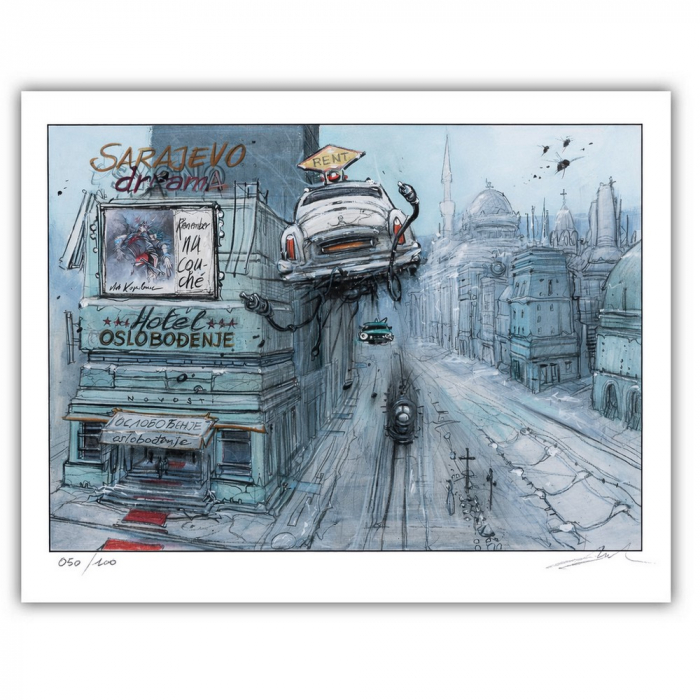 Estampa de pigmento artístico de un dibujo original de Enki Bilal. Papel Hahnemuhle Photo Rag 308g. Edición limitada y numerada a 100 unidades con certificado de autenticidad, firmado a mano por Enki Bilal. 50x40cm. Sarajevo-Drama.