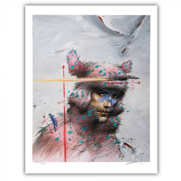 Estampa de pigmento artístico de un dibujo original de Enki Bilal. Papel Hahnemuhle Photo Rag 308g. Edición limitada y numerada a 150 unidades con certificado de autenticidad, firmado a mano por Enki Bilal. 50x40cm. BUG T3.