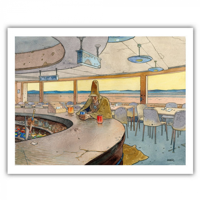 Estampa pigmentaria de arte impresa sobre papel Canson Infinity ARCHES® 88 de 310g/m2. Esta ilustración fue realizada en 2009 con motivo del lanzamiento de Arzak Tassili, presentada en toda su belleza en gran formato para resaltar sus colores y la calidad de su ejecución en tinta china y tintas de colores. Marco no incluido. Barvide. Jean Giraud. Certificado de autenticidad. Dimensiones: 80x60cm.