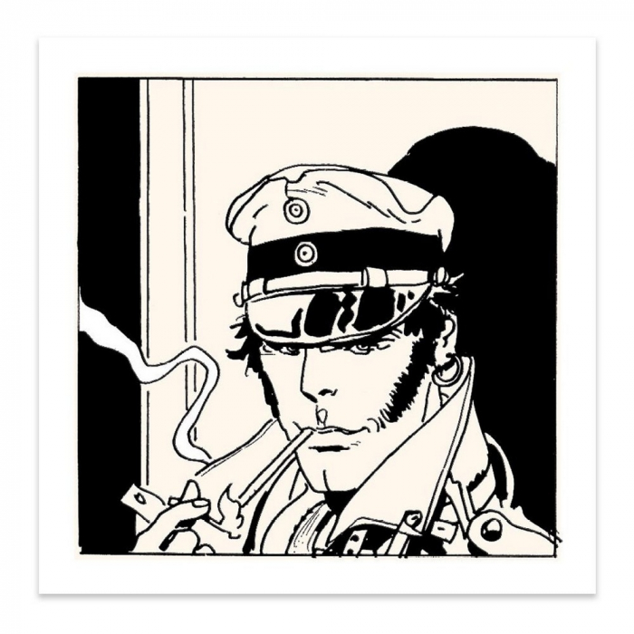 Serigrafía limitada de arte del comic Corto Maltés de Hugo Pratt. Edición limitada y numerada a 500 unidades con certificado de autenticidad. 30x30cm. Corto fumando.