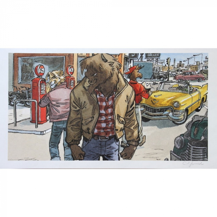 Este cartel offset del cómic Blacksad de Juanjo Guarnido está impreso en papel de alta calidad Rive Sensation 270g. 50x25cm. Abe y Chab. Firmado a mano por Juanjo Guarnido.