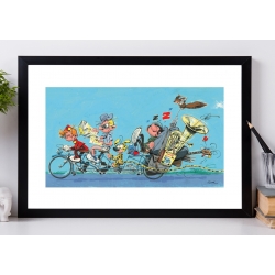 Este cartel offset del cómic Tomás el Gafe de Franquin está impreso en papel de alta calidad grueso. 60x40cm. Tomás el Gafe paseando en bicicleta con Spirou y Fantasio, Spip y el Marsupilami.
