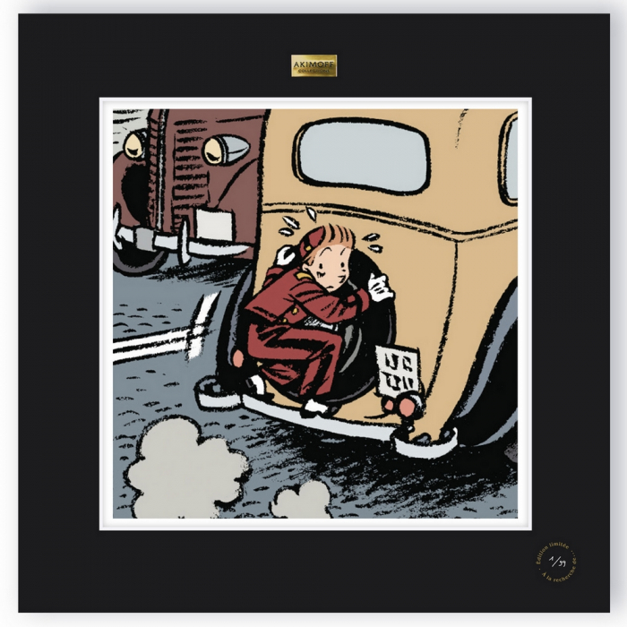 Este cartel offset del cómic Spirou de Émile Bravo está impreso en papel de alta calidad grueso Conquéror Connoisseur 100% algodón / 300g. Enmarcada en una Marie-Louise negra adornada con una placa de peltre Akimoff Collections. Edición limitada y numerada a 99 unidades. Dimensiones: 40x40cm. Diario de un ingenuo: Spirou huyendo.