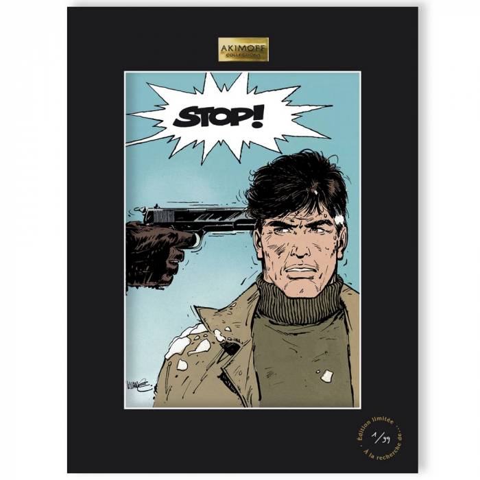 Este cartel offset del cómic XIII de William Vance y Jean Van Hamme está impreso en papel de alta calidad grueso Conquéror Connoisseur 100% algodón / 315g. Enmarcada en una Marie-Louise negra adornada con una placa de peltre Akimoff Collections. Edición limitada y numerada a 99 unidades. Dimensiones: 30x40cm. Stop.
