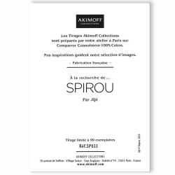 Póster offset derivado del cómics Spirou & Fantasio creado en 1941 por Joseph Gillain, alias Jijé a petición del editor Jean Dupuis. Impreso en papel de alta calidad grueso Conquéror Connoisseur 100% algodón / 315g. Enmarcada en una Marie-Louise negra adornada con una placa de peltre Akimoff Collections. Edición limitada y numerada a 99 unidades. Dimensiones: 30x40cm. Todos con Spirou.