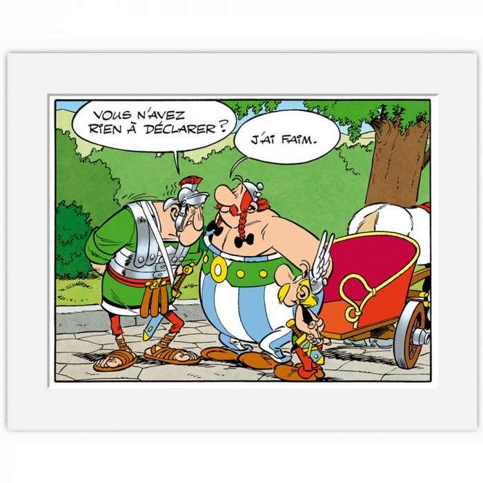 Impresión de arte oficial impresa en papel artístico Epson Cold Press Natural 300gr/m² con paspartú 1,5 mm. Edición limitada y numerada con certificado de autenticidad. Astérix, Obélix J'ai faim. Dimensiones: 50x40cm.