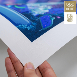 Producto con licencia oficial en edición de arte. Papel Hahnemühle FineArt Hemp 290g Marco no proporcionado. Impreso en Francia. Versión aniversario, edición Celebración del cartel oficial de los Juegos Olímpicos de París 2024, diseñado por el artista Ugo Gattoni. Edición limitada y numerada a mano a 2024 unidades. Sello en relieve que certifica su autenticidad. Dimensiones: 80x60cm.