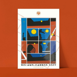 Producto con licencia oficial en edición de arte impresa en papel Fedrigoni de 200g. Marco no proporcionado. Impreso en Francia. Sello ciego en la esquina inferior derecha que certifica su autenticidad. Roland-Garros París 2025. Marc-Antoine Mathieu.