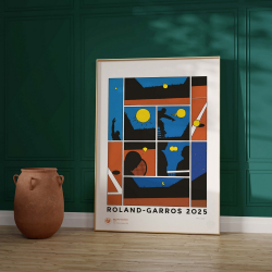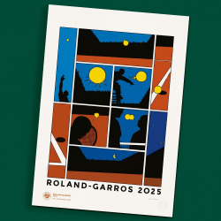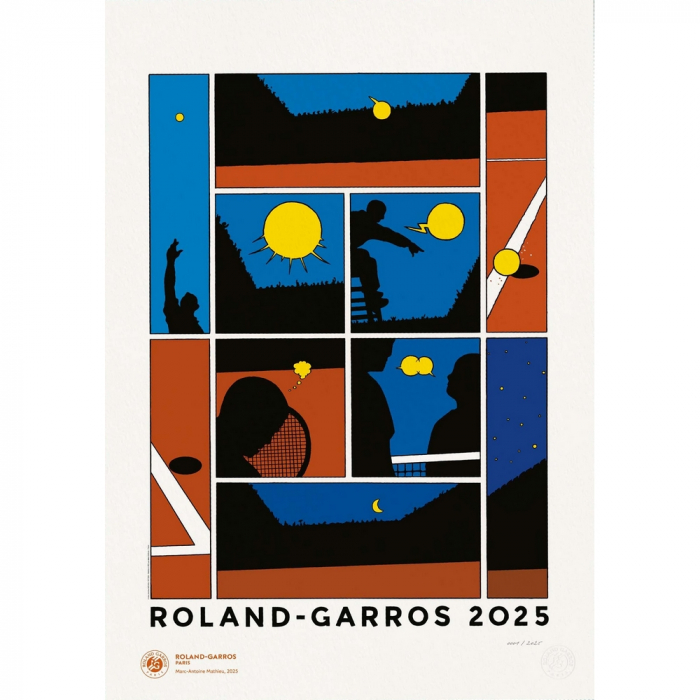 Producto con licencia oficial en edición de arte impresa en Papel Hahnemühle FineArt Hemp 290g. Marco no proporcionado. Impreso en Francia. Edición limitada y numerada a mano a 2025 unidades. Sello en relieve que certifica su autenticidad. Roland-Garros París 2025. Marc-Antoine Mathieu. Dimensiones: 70x100cm.
