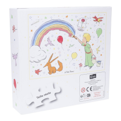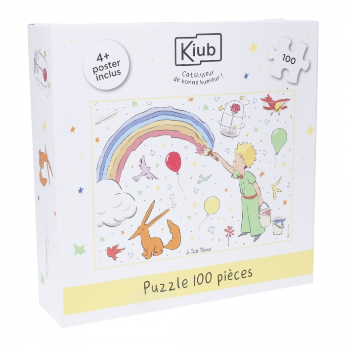 Puzzle de 100 piezas Kiub El Principito pintando un arcoíris. 4 carteles incluidos. Rompecabezas de cartón. Dimensiones del puzzle: 36x49cm.