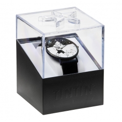 Reloj de pulsera con imagen de Tintín en acción: Classic L. Correa de piel de color negro. Se entrega en un elegante cofre joyero.