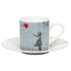 Porcelana de alta calidad de la marca alemana Könitz. Banksy: Niña con globo. Ideal para un regalo, compatible con microondas y lavavajillas. 95ml. Diámetro del platillo 12cm. Altura de la taza: 6cm.