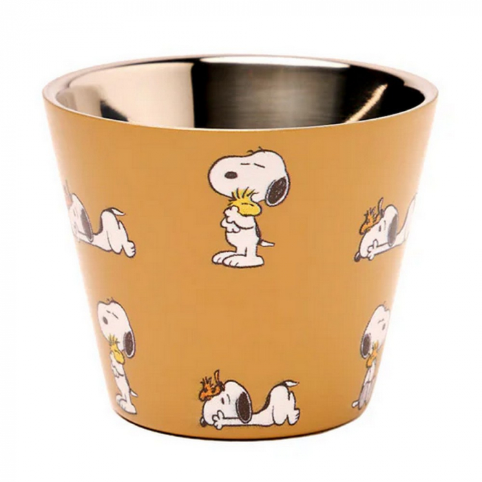 Taza de café expreso térmica Peanuts, Snoopy: Woodstock. Fabricada en acero inoxidable 304 de doble pared, libre de BPA. No apta para lavavajillas ni microondas. 90ml.