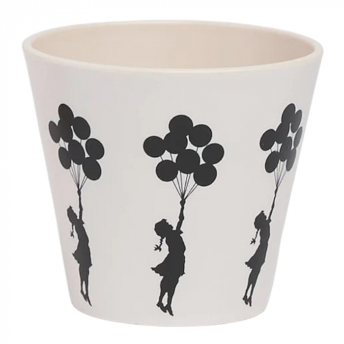 Taza de café expreso Banksy: Niña volando con globos. Fabricado con RPET (PET reciclado) para uso alimentario. Perfecto para bebidas frías y calientes. Sin olor ni sabor (libre de BPA). Resistencia térmica +120° -20°. Ideal para un regalo, apto para microondas y lavavajillas. 90ml.