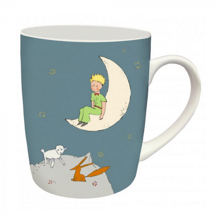 Taza de porcelana de la marca Kiub El Principito sentado en la luna. Ideal para un regalo, compatible con microondas y lavavajillas. El desayuno será mucho más divertido si eres fan de las míticas historietas del Principito. 340ml.