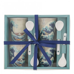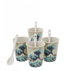 Set de 4 tazas con 4 cucharas de porcelana de la marca Enesco: Hokusai, Gran ola de Kanagawa. Producto con licencia oficial.