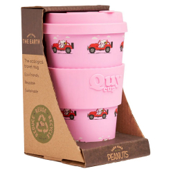 Taza de café para llevar de Peanuts Snoopy: en un coche rojo. Fabricado con RPET (PET reciclado) para uso alimentario. Tapa antigoteo patentada QuyCup, banda de silicona suave anti-escaldaduras. Perfecto para bebidas frías y calientes. Sin olor ni sabor (libre de BPA). Resistencia térmica +120° -20°. Ideal para un regalo, apto para microondas y lavavajillas. 400ml.