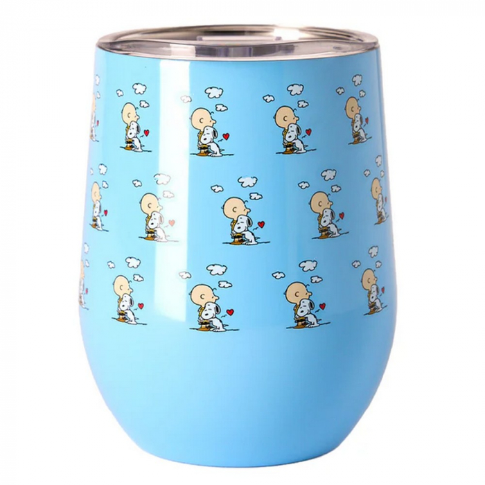 Taza mug térmica para llevar QuyCup Peanuts Snoopy: Abrazando Charlie Brown. Fabricado en acero inoxidable 304 de doble pared. Mantiene las bebidas calientes durante 6 horas y las bebidas frías durante 12 horas. Libre de BPA. Tapa no hermética. No apto para lavavajillas ni microondas. 300 ml.