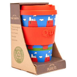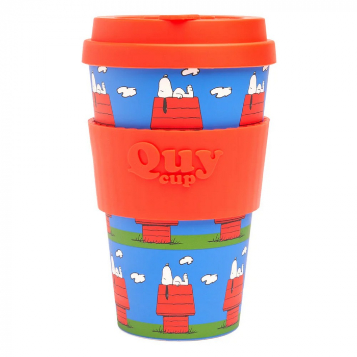 Taza de café para llevar de Peanuts Snoopy: Caseta. Fabricado con RPET (PET reciclado) para uso alimentario. Tapa antigoteo patentada QuyCup, banda de silicona suave anti-escaldaduras. Perfecto para bebidas frías y calientes. Sin olor ni sabor (libre de BPA). Resistencia térmica +120° -20°. Ideal para un regalo, apto para microondas y lavavajillas. 400ml.