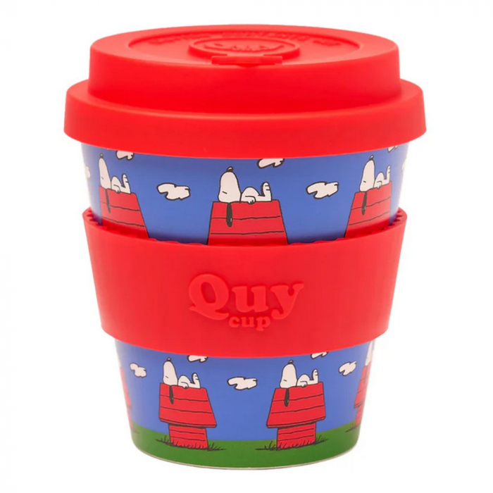 Taza de café para llevar de Peanuts Snoopy: Caseta. Fabricado con RPET (PET reciclado) para uso alimentario. Tapa antigoteo patentada QuyCup, banda de silicona suave anti-escaldaduras. Perfecto para bebidas frías y calientes. Sin olor ni sabor (libre de BPA). Resistencia térmica +120° -20°. Ideal para un regalo, apto para microondas y lavavajillas. 230ml.