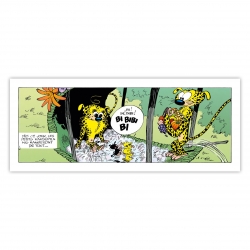 94,95 € Dispo sur commandeReproduction fidèle d'une case BD sur toile imprimée issue de la série Spirou et Fantasio. Les Editions du Grand Vingtième, dimensions: 60x40cm. Cadre en bois des Ardennes. Palombian World Airways, Seccotine en compagnie du Marsupilami et de Spip, issue de l'aventure: L'Ombre du Z !