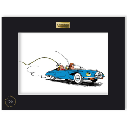 65,00 € En stockAffiche offset d'art dérivée de la BD Spirou & Fantasio. La bande à Spirou et la Turbotraction. Imprimée sur un papier d'art Conquéror Connoisseur 100% coton/315g. Chaque exemplaire est encadré dans une Marie-Louise noire ornée d’une plaque en étain Akimoff. Edition limitée et numérotée à 99 exemplaires. Dimensions: 30x40cm. Turbotraction.
