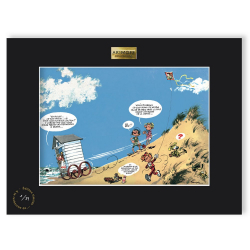 62,00 € En stockCette affiche offset d'art dérivée de la bande dessinée de Gaston Lagaffe par Franquin est imprimée sur un papier d'art Conquéror Connoisseur 100% coton / 315g. Chaque exemplaire est encadré dans une Marie-Louise noire ornée d’une plaque en étain Akimoff. Edition limitée et numérotée à 99 exemplaires. Dimensions: 40x30cm. EH BEN ?!