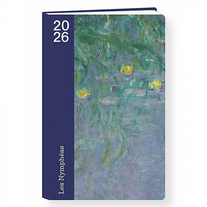 Agenda Annuel Claude Monet 2026. Fabriqué en France sur papier PEFC 100% recyclé par un imprimeur certifié Imprim'Vert. Dimensions: 10x16cm. 5 langues: anglais, espagnol, français, allemand et italien. 12 mois de janvier à décembre 2026.
